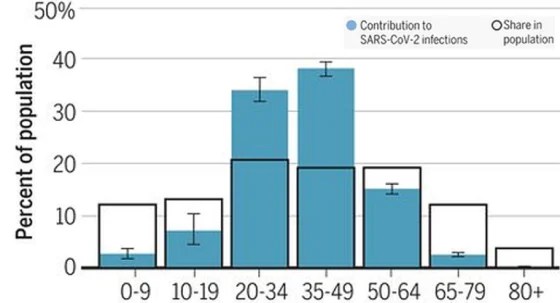 Population share and contribution to covid infections per age group in the US (Monod, Science, March 2021)