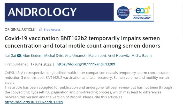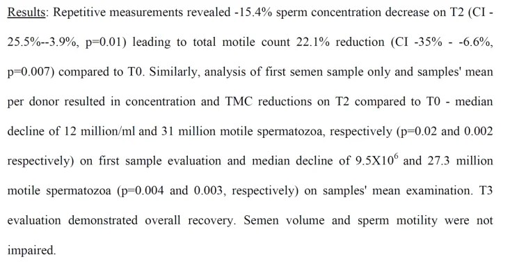 Over the first pandemic months, there was insufficient data regarding the possible impact of Covid-19 on human reproduction. Yet, it was clear it employs the Angiotensin-Converting Enzyme 2 (ACE2) receptor for cellular entry 3, 4. Various testicular cells including Leydig, Sertoli, spermatogonia and spermatozoa express ACE2 and related proteases resulting with viral fusion 5, 6. Cytokine storm-induced dysfunction, autophagy regulation and damaged blood-testis barrier were also suggested as possible pathogenic mechanism for testicular damage 7. Clinical reports of orchitis, supported by histological findings, further emphasized testicular involvement 8, 9. Therefore, detrimental impact on both spermatogenesis and testosterone production 10 seem an obvious outcome they evaluated donors from 3 sperm banks over a longitudinal period commencing before pfizer vaccine and following up after.