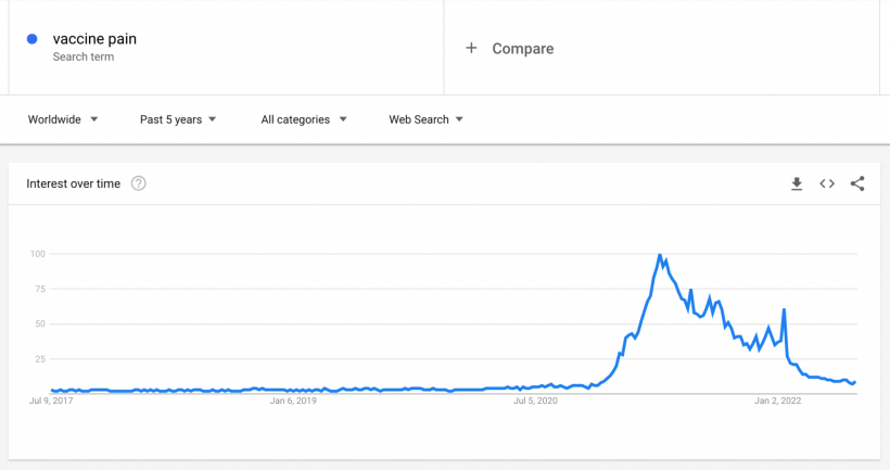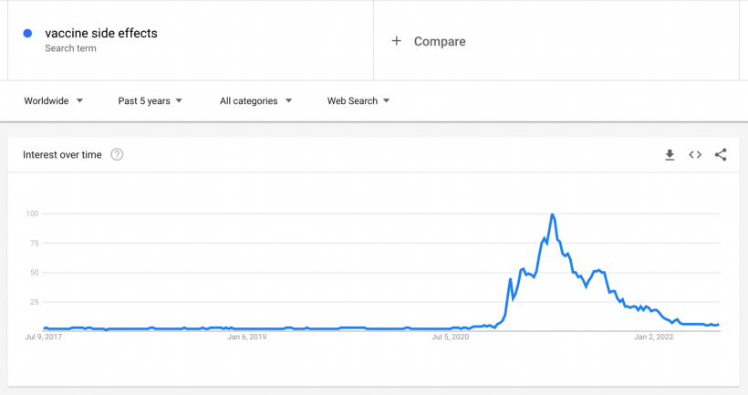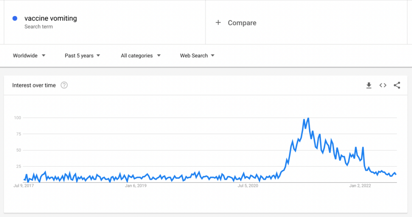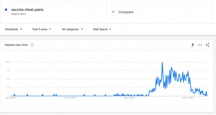 Noteworthy is that “death after vaccine” wasn’t the only term that saw an increase in searches. So did “vaccine chest pains”, “vaccine side effects”, “vaccine pain” and “vaccine vomiting”.