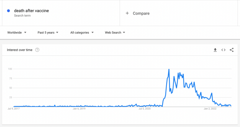An increase in searches for the term “death after vaccine” could be interpreted as being due to people looking specifically for that kind of data. However, it could also be due to people knowing someone who died shortly after getting injected and looking for more information.