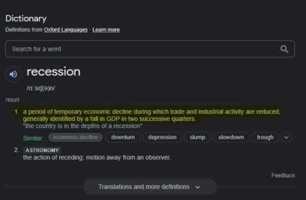 Our new series of micro-articles deals with the newly everyday occurrence of the modern media simply changing what a word means. Today’s word is “recession”.