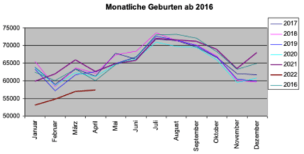 “Compared to the previous year, the number of births has fallen by 12 percent – that’s about 25,000 fewer births in the first four months of 2022,” reports Sternfried Müller of transitionnews.de.