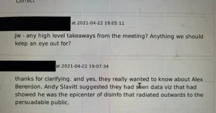 In another Slack message, a Twitter employee says that the White House “really wanted to know about Alex Berenson” and that Andy Slavitt, a Senior Advisor to President Biden’s COVID-19 Response Coordinator, “suggested they had seen data viz that had showed he was the epicenter of disinfo that radiated outwards to the persuadable public.”