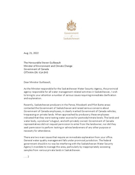 In the letter, the Minister raised multiple complaints from Saskatchewan farmers that raised “serious concerns about Government of Canada employees, in clearly marked Government of Canada vehicles, trespassing on private lands.” The farmers reporting these trespasses made clear that these government agents did not request permission to access the land and were not in any other manner given consent to access it.