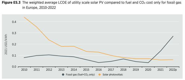 You can see right there that here in 2022 power from natural gas is at least three times as expensive as power from solar PV cells. But the title of the chart gives away that the metric for comparison is LCOE.