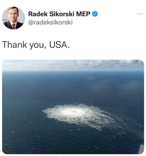 Following the sabotage of the Nord Stream 1 and 2 gas pipelines, former Polish Foreign Minister Radoslaw Sikorski already seemed to know the identity of the perpetrator when he tweeted out: “Thank you, USA.”