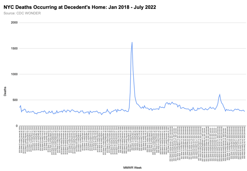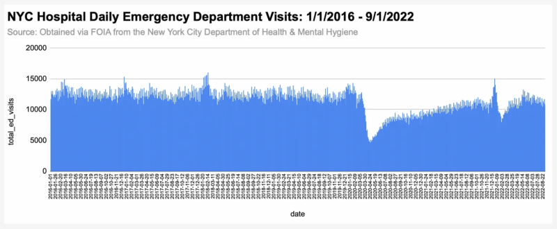 Repeat after me: New York City’s emergency rooms were not overwhelmed by visits in spring 2020. In fact, they were busier during the 2017-2018 flu season than they were at any point between lockdown orders and January 2022’s “omicron surge.”