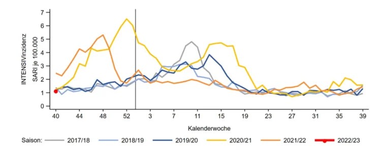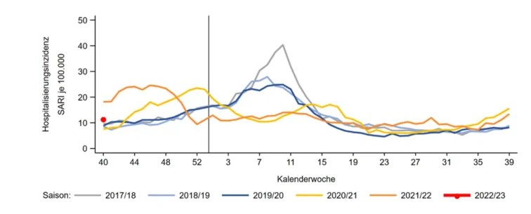 If you look at hospitalisations, though, you’ll have a hard time finding any crisis at all. Here, for example, are hospitalisations for severe acute respiratory infections since 2017, as published last week by the Robert Koch Institut: