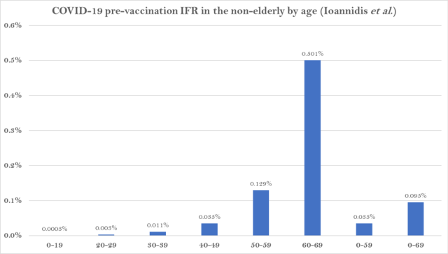 In the new study, which is currently undergoing peer-review, Prof. Ioannidis and colleagues found that across 31 national seroprevalence studies in the pre-vaccination era, the average (median) infection fatality rate of COVID-19 was estimated to be just 0.035% for people aged 0-59 years people and 0.095% for those aged 0-69 years. A further breakdown by age group found that the average IFR was 0.0003% at 0-19 years, 0.003% at 20-29 years, 0.011% at 30-39 years, 0.035% at 40-49 years, 0.129% at 50-59 years, and 0.501% at 60-69 years.