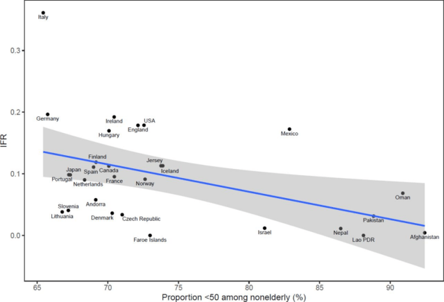 The reason some countries had much lower values and some much higher is not completely clear. The authors suggest that “much of the diversity in IFR across countries is explained by differences in age structure”, as per the plot below.