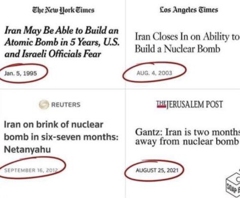 While Israel has offered little evidence supporting the existence of an Iranian nuclear weapons program, officials have claimed for decades that Tehran is on the cusp of developing its own bomb. The Islamic Republic has denied any plans to build nuclear weapons – with Supreme Leader Ayatollah Ali Khamenei issuing a fatwa (religious decree) against all weapons of mass destruction in 2003 – and passed numerous inspections by the UN’s nuclear watchdog under a major deal signed with world powers in 2015.