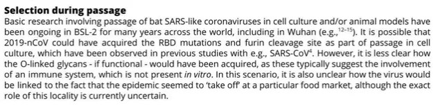 The draft statement itself (at p. 67 here) is mostly unremarkable and not all that different from the Nature piece. It insists, in bold on the first page, that “Analysis of the virus genome sequences clearly demonstrates that the virus is not a laboratory construct or experimentally manipulated virus.” At least some of its authors, though, especially Edward Holmes, were willing to entertain the lab leak hypothesis, and the consequence was this paragraph considering the possibility that SARS-2 had been enhanced by repeated passage in cell cultures or animals: