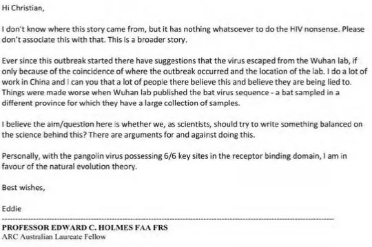 Edward Holmes (who Farrar elsewhere says is leaning “60-40” for the laboratory origins of SARS-2) has to bring him up to date: