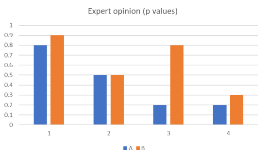 - They differ on the cause of the warming. Expert A doubts that it is man-made, whereas Expert B believes strongly that it is (p3=0.2; q3=0.8);