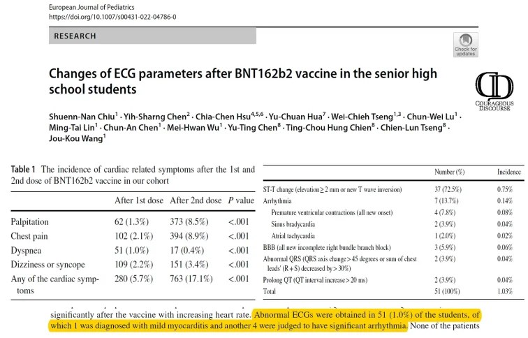 I have said on national TV throughout the COVID-19 vaccine campaign that no young person should receive a shot because the risks far outweigh the benefits. Chiu et al published a report where both cardiac symptoms and ECG changes were recorded after the first and second injections. The results are alarming. After the second injection of mRNA 17.1% of students reported cardiovascular symptoms.