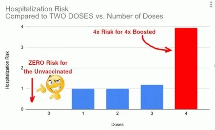 Businessman and mathematician Igor Chudov, reporting here on the NSW findings, acknowledges that the figures will be skewed by differences in how many people have had the different number of shots. After adjusting for those differences, however, he finds that the four-times-jabbed have a four times increased risk of hospitalisation compared with those who had two shots.