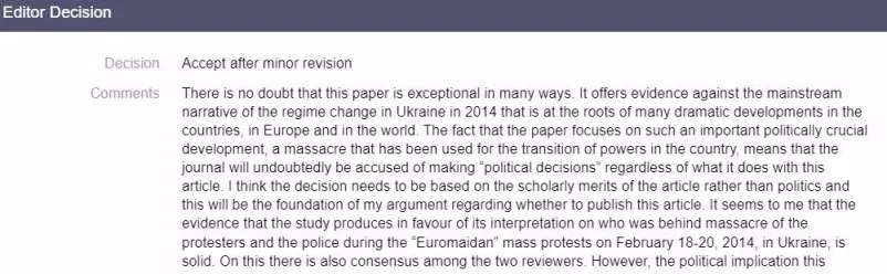 This was about to change, Katchanovski thought in November, when it was accepted for publication at an academic journal. Indeed, the paper was accepted “after minor revision” – which means the reviewers didn’t recommend any fundamental changes.