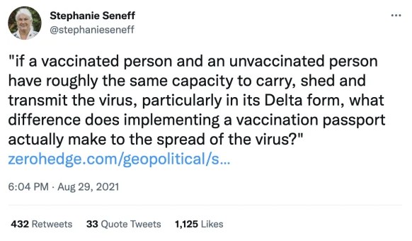 Fang also noted that this campaign flagged a tweet from senior Massachusetts Institute of Technology (MIT) scientist Stephanie Seneff that questioned vaccine passports on the basis that vaccinated and unvaccinated people have “roughly the same capacity to carry, shed and transmit the virus.”