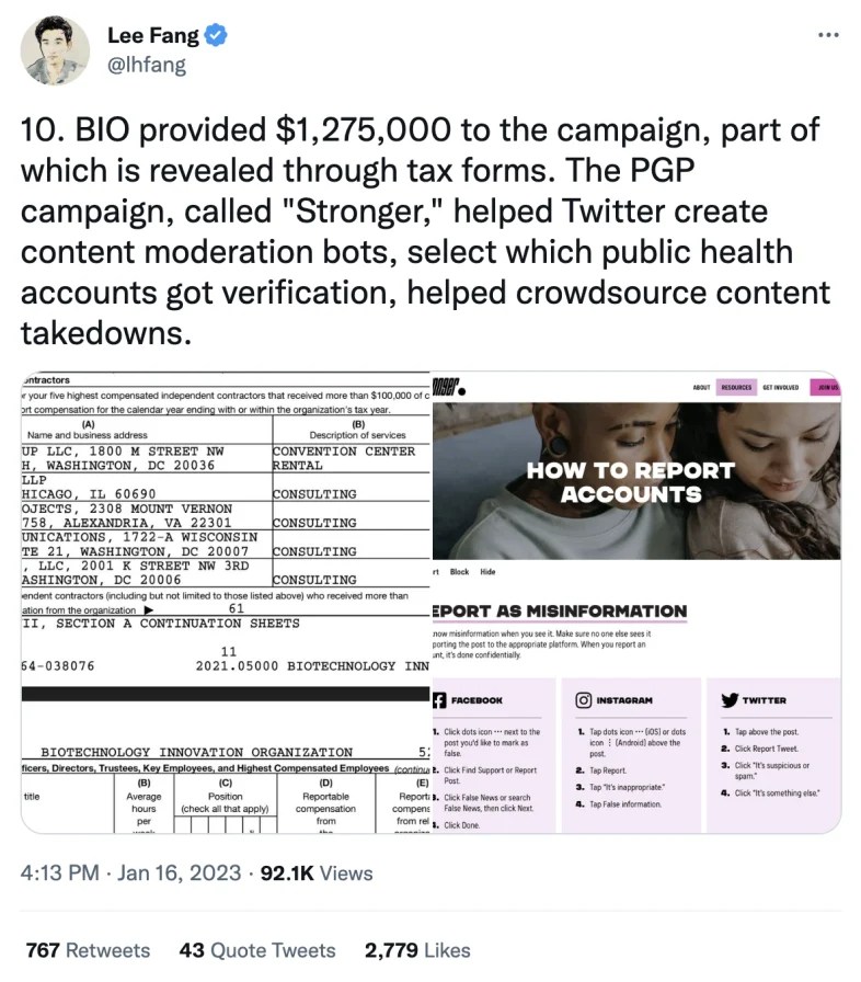 The Public Good Projects (PGP), a nonprofit that has developed several projects to fight so-called Covid “misinformation,” received $1,275,000 from the Pfizer and Moderna lobbying group, Biotechnology Innovation Organization (BIO), to create a content moderation campaign that influenced Twitter’s Covid misinformation rules. As part of this campaign, PGP sent Twitter lobbyists and content moderators weekly emails containing lists of tweets to censor.