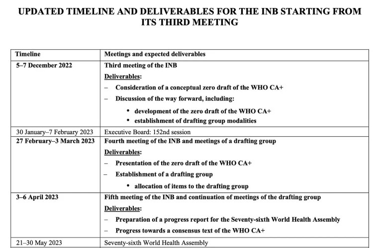 It’s urgent to oppose this before it rolls over us like a steamroller. The World Health Organisation is working hard on the next draft, for consideration by the “Intergovernmental Negotiating Body” in February, and the World Health Assembly in May 2023 (see timeline below)