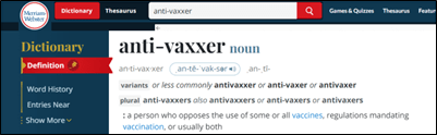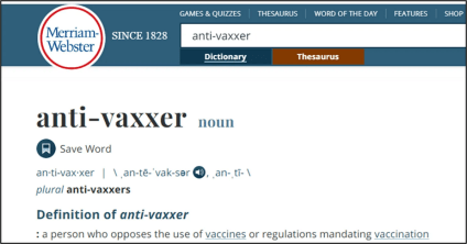 The old definition included “a person who opposes the use of vaccines or regulations mandating vaccination”: