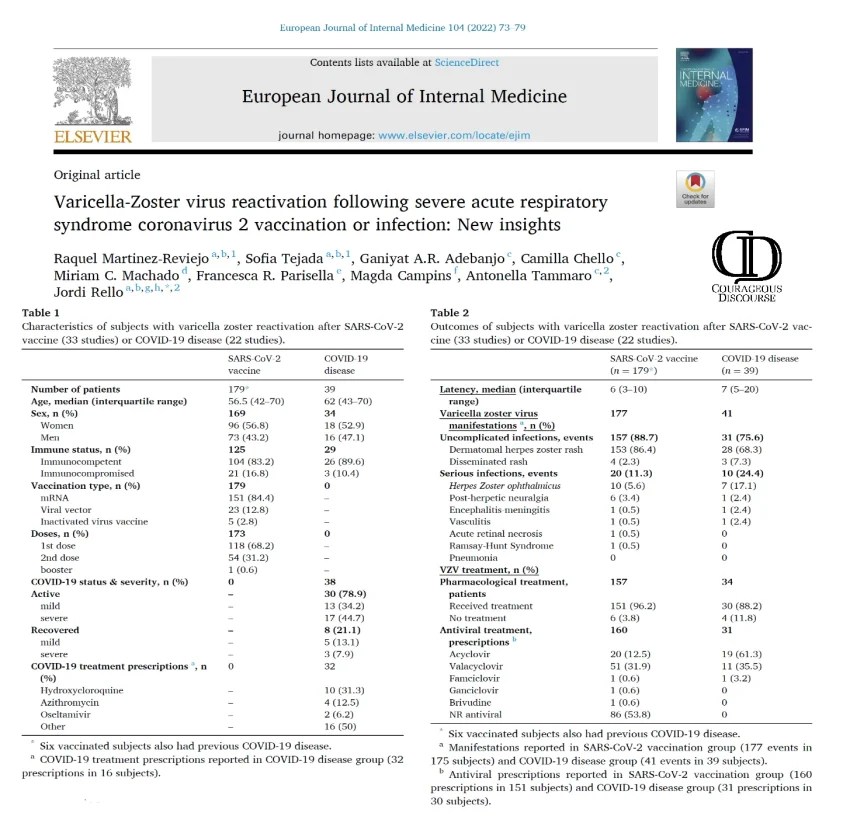 Martinez-Reviejo R, Tejada S, Adebanjo GAR, Chello C, Machado MC, Parisella FR, Campins M, Tammaro A, Rello J. Varicella-Zoster virus reactivation following severe acute respiratory syndrome coronavirus 2 vaccination or infection: New insights. Eur J Intern Med. 2022 Oct;104:73-79. doi: 10.1016/j.ejim.2022.07.022. Epub 2022 Aug 1. PMID: 35931613; PMCID: PMC9340059.