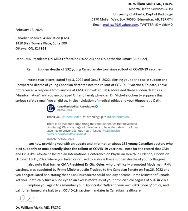 I have sent a third letter to the Canadian Medical Association (“CMA”) about these sudden deaths. To date, CMA has refused to respond. CMA fully supported unscientific and unethical COVID-19 vaccine mandates that were forced on their own physician members. Now this Ottawa-based bureaucracy ignores the damage done.
