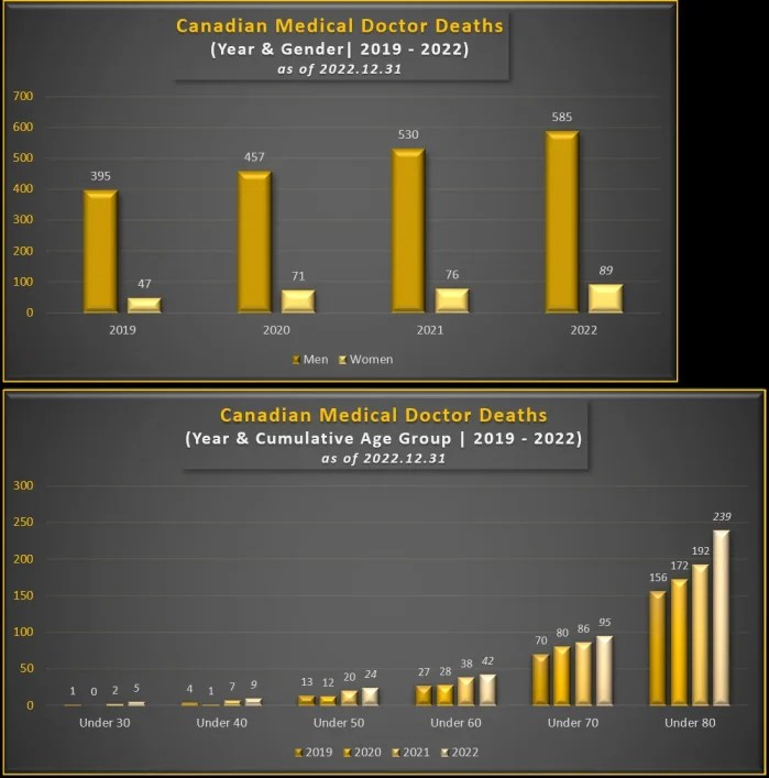 Canadian physician mortality in 2022 was 53% higher than 2019, based on the largest database of its kind assembled diligently by our team (a total of 2250 doctor deaths documented, spanning the years 2019-2023). This data is solid.