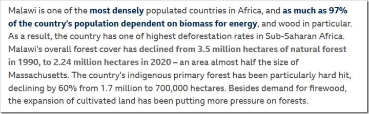 Nearly a year ago, the New York Times ran a devastating story about the deforestation crisis in Malawi and its impact on residents of Lilongwe, Malawi’s capital city. Illegal cutting of nearby forests was causing water shortages and disrupting the city’s hydroelectric power supply, forcing the government to deploy soldiers to protect the forests. The root of this problem was Malawi’s dependence on wood for meeting energy needs―more specifically, charcoal. Nearly 97 percent of Malawian households depend on wood or charcoal for cooking or heating. Even in urban areas, 54 percent of households use charcoal (a product of wood) for cooking. But there are only so many trees.