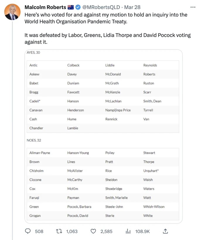 The motion, which was introduced by Senator Malcolm Roberts, called for the WHO’s international pandemic treaty to be referred to the Foreign Affairs Defense and Trade References Committee for an inquiry.