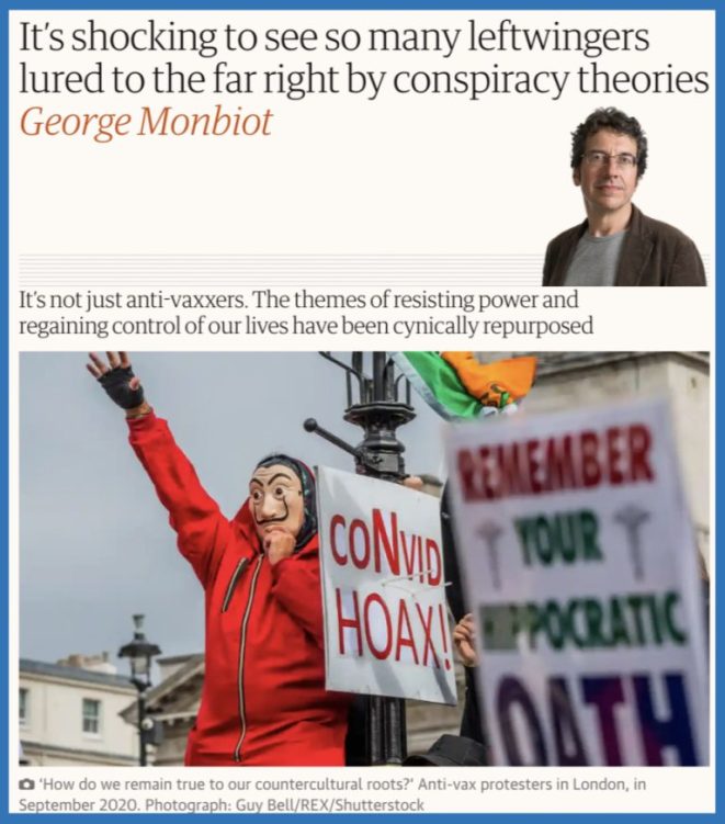This delightful piece is replete with a Nazi salute, the use of ‘anti-vaxxer’ and conspiracy theorist slurs, a masked madman, a ‘convid hoax’ poster topped off with a title suggesting that you must be far right if you even dare to entertain any associated wrongthink. The Guardian has managed, in one fell swoop, to totally delegitimize anyone asking any questions about the covid narrative. After all, who wants to risk being lumped in with this masked nutjob? Keep your head down, your thoughts to yourself and ideally stop thinking them altogether. The parapet does not require your presence, move along please.