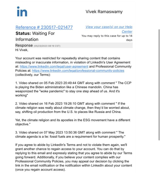 “I was a bit surprised to get an email noting that my LinkedIn account had been shut down,” Ramaswamy said in a video. “I wondered why, ‘cause actually a number of friends texted me saying they follow me on LinkedIn. That’s how they keep up. They weren’t able to find me anymore. And so when I had my team get in touch with LinkedIn, here’s the response that we got.”