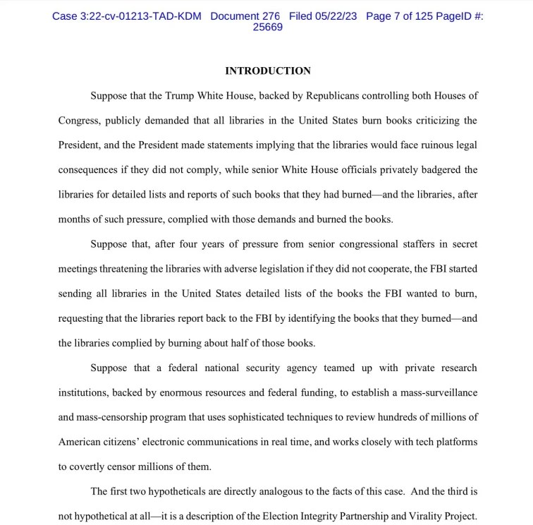 Plaintiffs begin with a hypothetical, and they do this because the government tried to make all of this behavior “OK” by claiming that the Trump administration did the same thing. That is an exercise in futility—the Plaintiff’s don’t care what administration did it, only that it happened, and besides, the Trump White House directed NONE of this activity. As an added zing (in my opinion): they used book burning as their hypothetical—this appeals directly to the left angry that we don’t want pornographic books in kids libraries.