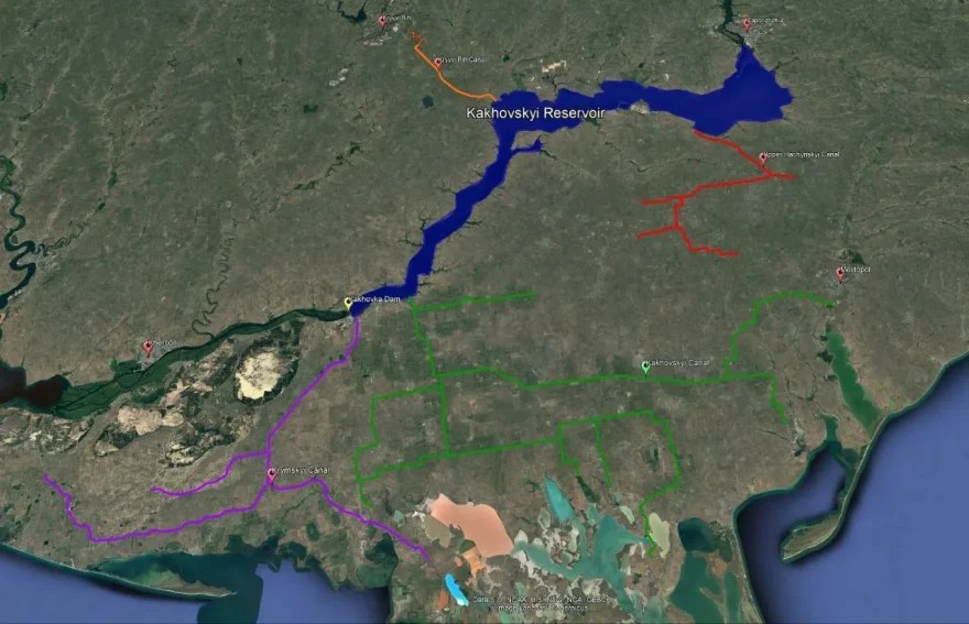 The creation of the Kakhovka resevoir was also vitally linked to a series of canals which are fed from the resevoir. The most important of these is the Crimean canal, which carries Dnieper water to Crimea, but there are also a series of irrigation works which are vital to agricutlure in Kherson and Zaporizhia oblasts.