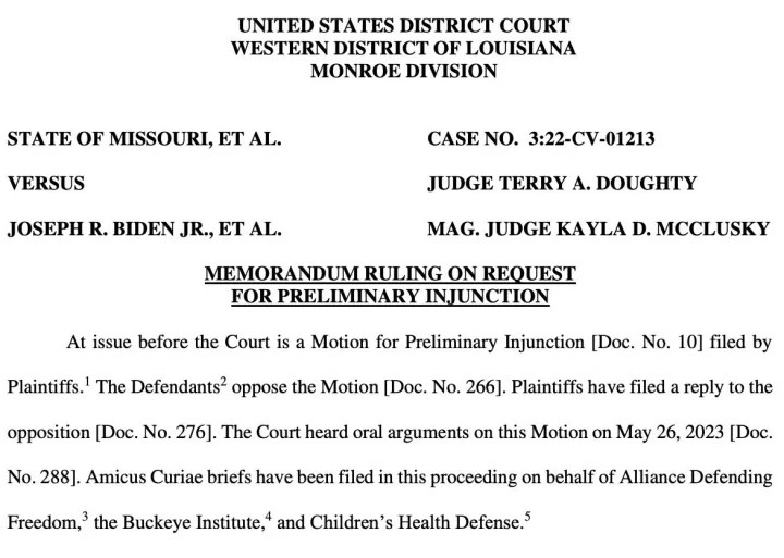 Fittingly, on Independence Day, July 4, U.S. Federal Judge Terry A. Doughty in the Western District of Louisiana, issued a preliminary injunction in the case of Missouri v. Biden, documenting and excoriating the Federal government’s abrogation of the First Amendment with regard to policing social media.