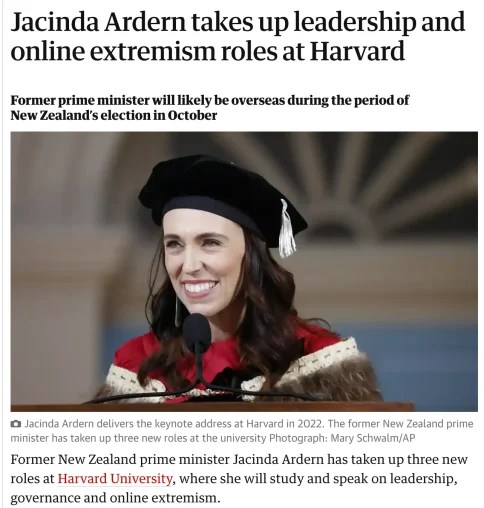 Former New Zealand Tyrant Jacinda Ardern delivering keynote address at Harvard