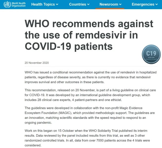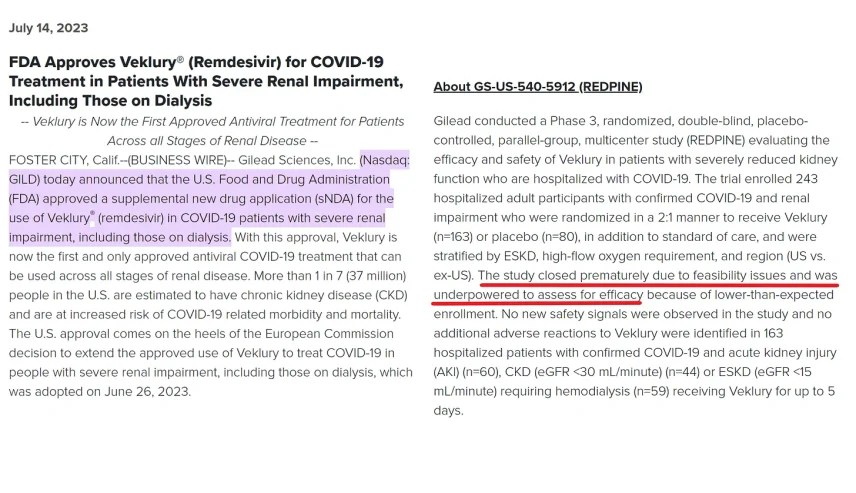The phase 3 REDPINE trial failed to recruit sufficient subjects to assess efficacy. Instead of properly rejecting the application, the FDA went ahead and approved the drug with insufficient safety and efficacy data. The drug has struggled in recent years as patients commonly decline the antiviral since the November, 2020, WHO warning against inpatient use. Remdesivir can cause both kidney injury and liver damage, thus with no mortality benefit, many believe it should not be used.