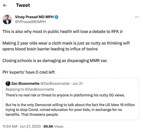 Even Dr. Vinay Prasad, a sensible critic of public policy over the last three years tweeted that while Kennedy would be a formidable opponent in a debate with the scientific orthodoxy, his position on radiation spewing from your wifi router was nuts: