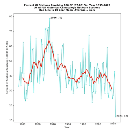 The fact is that the percentage of the United States that reaches 38°C sometime during the year has plummeted since the 1930s.