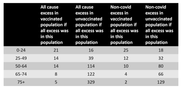 Table 1: Percentage increase in deaths (July 2022-Sept 2023) by age group if all excess were in vaccinated vs unvaccinated populations. First two columns are for all cause deaths and the second two exclude deaths blamed on covid.