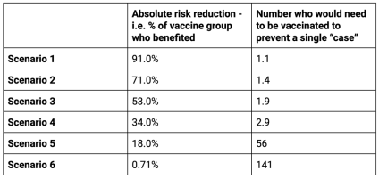 For the first two scenarios the people taking the treatment are more likely to directly benefit than not. For scenarios 3 and 4 there is still a high possibility of direct benefit. However, for the last two scenarios the chances of not directly benefiting are far higher than the chance of benefitting. It is possible in these scenarios that a longer follow up would improve the situation as more people would develop disease or be protected from it. However, the evidence of waning means that the time frame of follow up is close to the maximum possible period of benefit anyway.The important lesson here is that looking at the relative risk reduction as presented in the trials on its own is a meaningless measure. That is why the industry’s own code of practice says, “Referring only to relative risk, especially with regard to risk reduction, can make a medicine appear more effective than it actually is. In order to assess the clinical impact of an outcome, the reader also needs to know the absolute risk involved. In that regard, relative risk should never be referred to without also referring to the absolute risk.” The efficacy claims, even if we trust the results, were presented to the public in a way that could be deliberately misinterpreted.