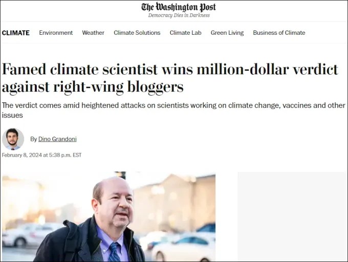 This framing — climate deniers versus climate science — has also characterized mainstream media coverage. For instance, The Washington Post announced, on the day that the case went to the jury, that this case was part of a “mounting campaign” against “right-wing trolls” (below).