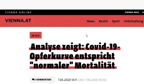 - Even the decidedly mainstream vienna.at on April 7, 2020 reported that: “Analysis shows: Covid-19 victim curve corresponds to “normal” mortality”, concluding: “The Covid-19 victim curve in Austria roughly corresponds to the “normal” mortality for men and women in the individual age groups”.