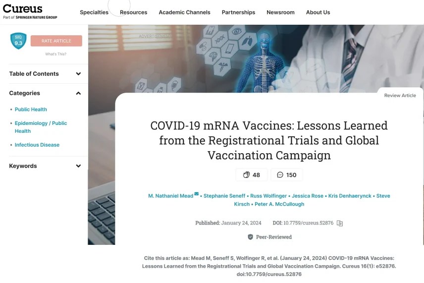 Mead MN, Seneff S, Wolfinger R, Rose J, Denhaerynck K, Kirsch S, McCullough PA. COVID-19 mRNA Vaccines: Lessons Learned from the Registrational Trials and Global Vaccination Campaign. Cureus. 2024 Jan 24;16(1):e52876. doi: 10.7759/cureus.52876. Retraction in: Cureus. 2024 Feb 26;16(2):r137. doi: 10.7759/cureus.r137. PMID: 38274635; PMCID: PMC10810638.