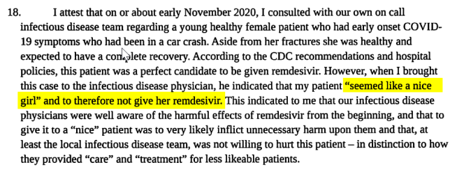 - a treatment was actively avoided here “because she was nice” — indicating that the doctors knew that per-protocol they ought to be giving treatments which they themselves knew to be harmful