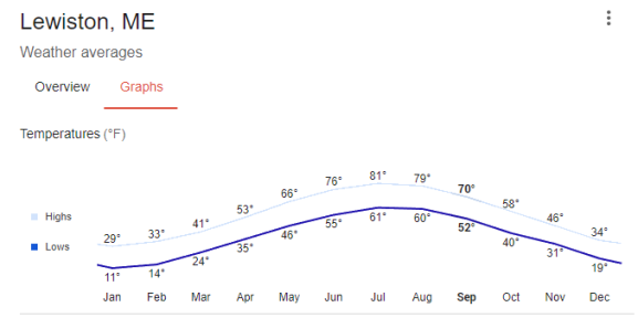 Figure 3: Normal average daily fluctuations in temperatures throughout the year for Lewiston Maine. Source: Google