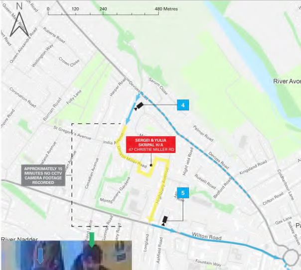 In the summary presented to Hughes’ courtroom for the first time of CCTV imagery, there is no evidence at all that the assassins came close to the Skripal house, neither on their first walking tour of the town on March 3, nor on the following fateful day, March 4.