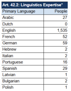 Finally, it is worth noting that the overwhelming majority of these reports and the related “enforcement actions” undoubtedly involve English-language content. This can be gleaned from the fact that nearly 90% of X’s “content moderation team” consists of English speakers. The “primary language” of 1,535 of the team’s 1,726 members is English, as can be seen in the below chart.