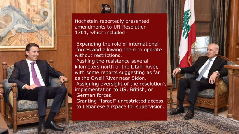 However, Parliament Speaker Nabih Berri reaffirmed Lebanon’s commitment to Resolution 1701, with no amendments. He emphasized that this is the final opportunity for the US to intervene diplomatically and halt the war. Berri made clear that Lebanon stands united on Resolution 1701, and that “Israel” must respect it. He anticipated that Hochstein would push Israel’s maximum demands but remained confident that nothing could be imposed on Lebanon. “Israel” has failed to achieve its objectives on the battlefield, and it will not succeed through diplomacy either.