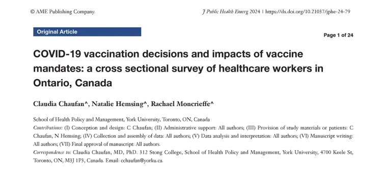 C. Chaufan and N. Hemsing and R. Moncrieffe, “COVID-19 vaccination decisions and impacts of vaccine mandates: a cross sectional survey of healthcare workers in Ontario, Canada”, Journal of Public Health and Emergency (2024), Online First, https://jphe.amegroups.org/article/view/10313